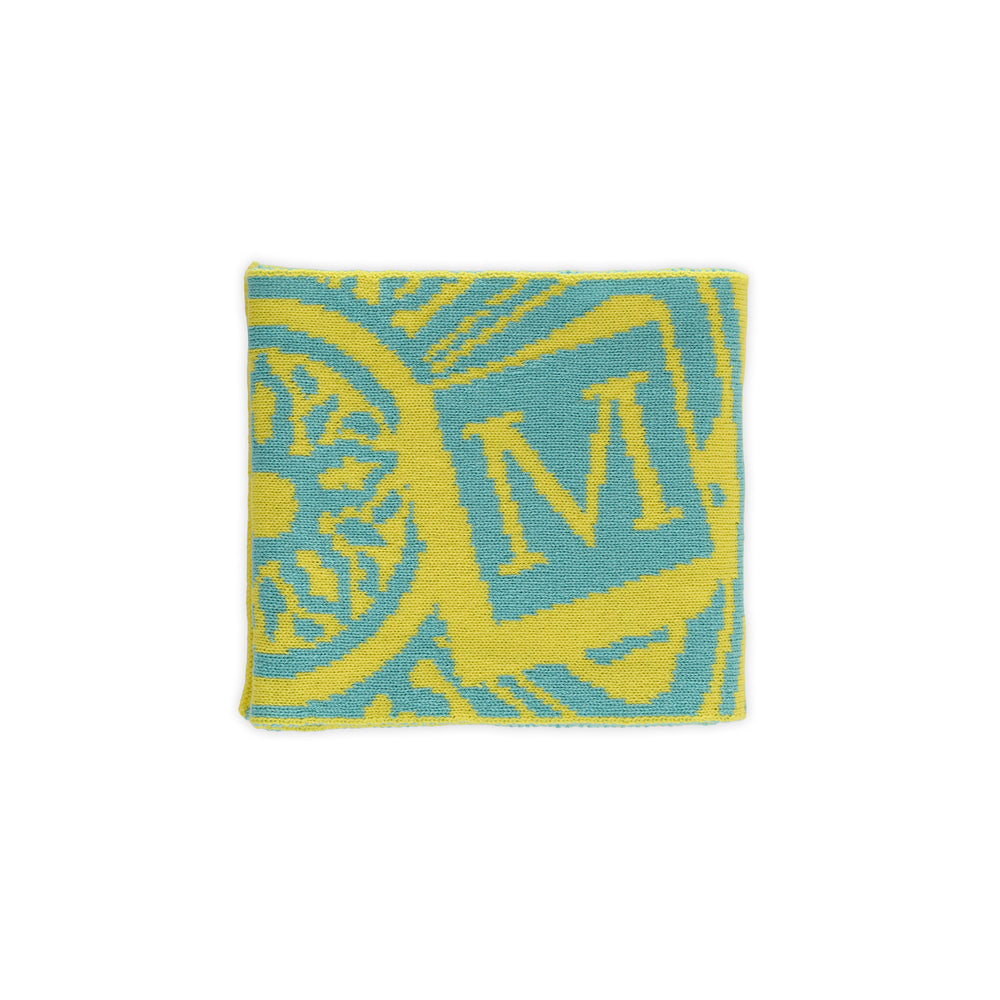 This scarf is created from two yarns so the pair of colours has to be carefully chosen. Yellow and turquoise sit apart on the colour wheel, forming a complementary yet playful combination. The interaction between the luminous yellow and the cool, oceanic turquoise effortlessly draws the eye, evoking a sense of freshness and vibrant energy.