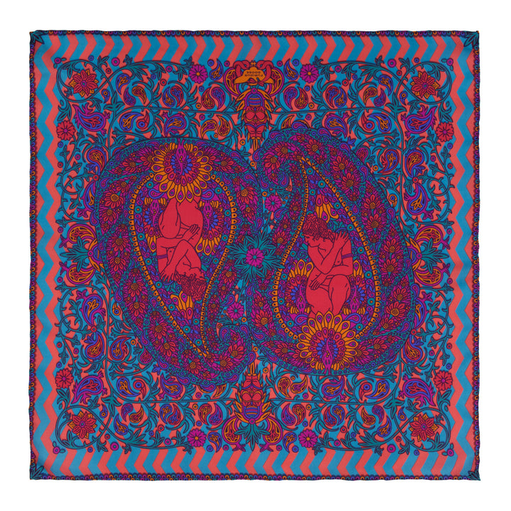 Contemporary Paisley Print silk handkerchief in a sumptuous palette of coral, cyan, purple and scarlet. Featuring the Crouching Venus and the Venus of Willendorf.
