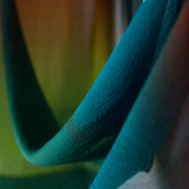 This chiffon silk scarf blends alpine green with burnt orange and lime in a striking gradient. Inspired by color field paintings and the beauty of nature, it’s a versatile statement piece. Hand-rolled hems add a refined finish, making this a standout addition to any wardrobe.