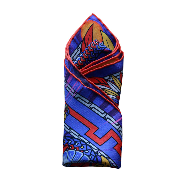 Vivid pocket square in primary colours featuring flying serpent god Quetzalcoatl