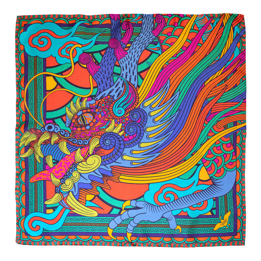 Silk pocket square in psychedelic colours featuring a South Asian dragon