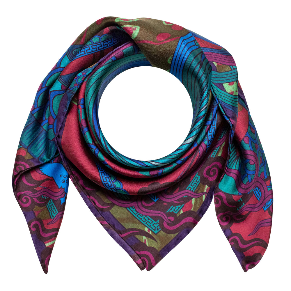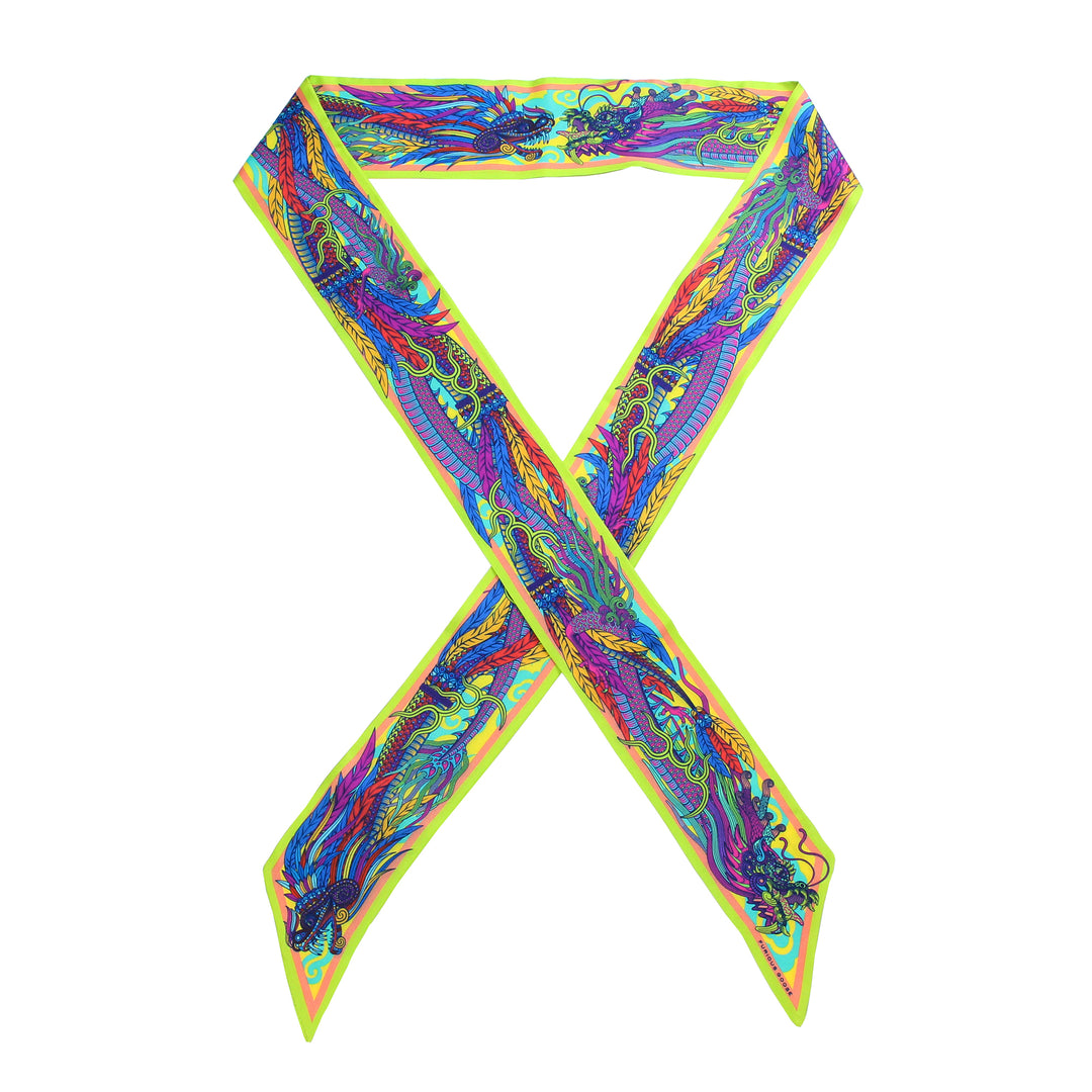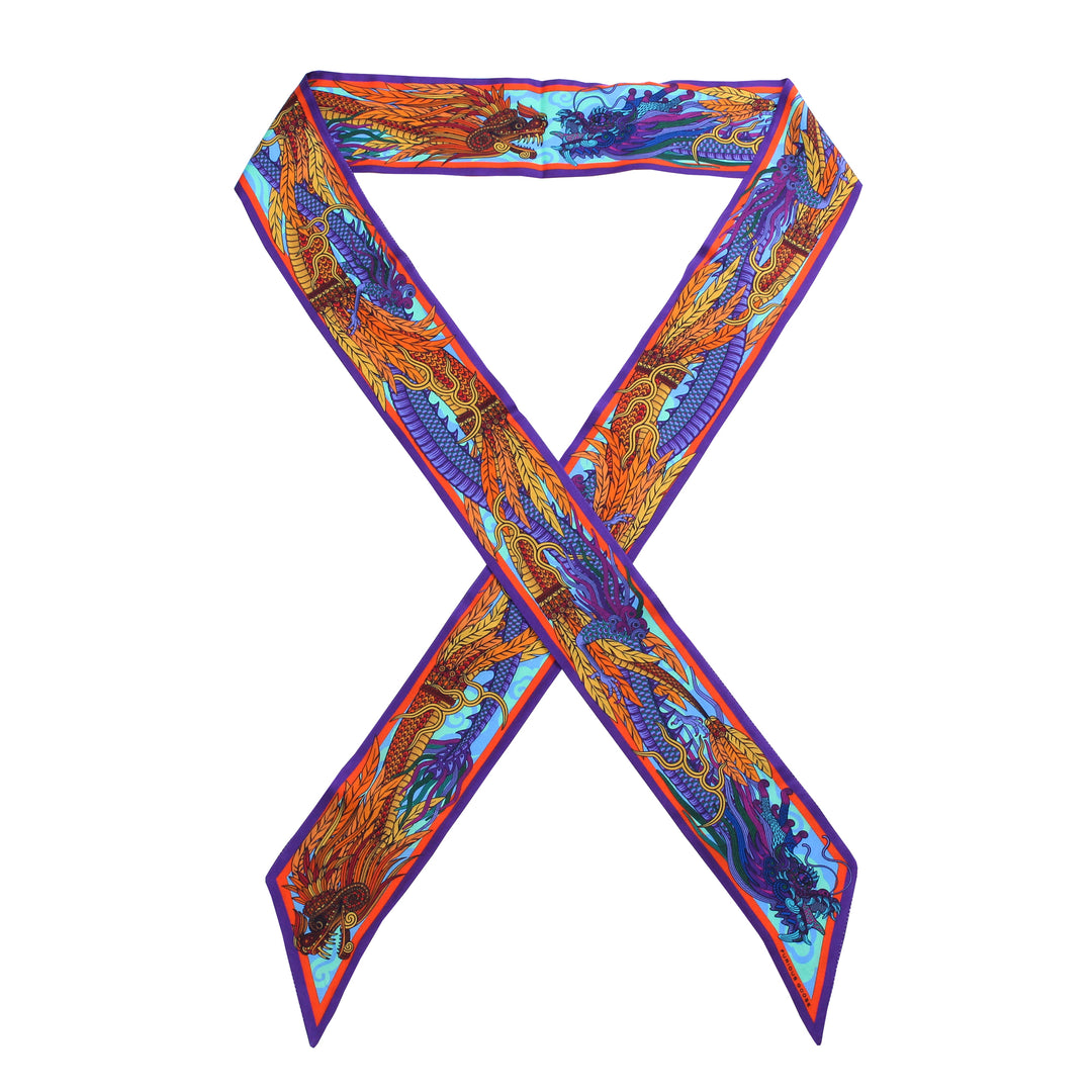 Dragons a symbol of elemental power and of good fortune, inspiring fear and wonder in equal measure.In our Dragon collection of luxury accessories we have brought two of these legendary creatures to life on silk. All tooth and claw is the lucky East Asian Dragon. And all feather and fang is Quetzalcoatl the flying serpent god of the Americas.