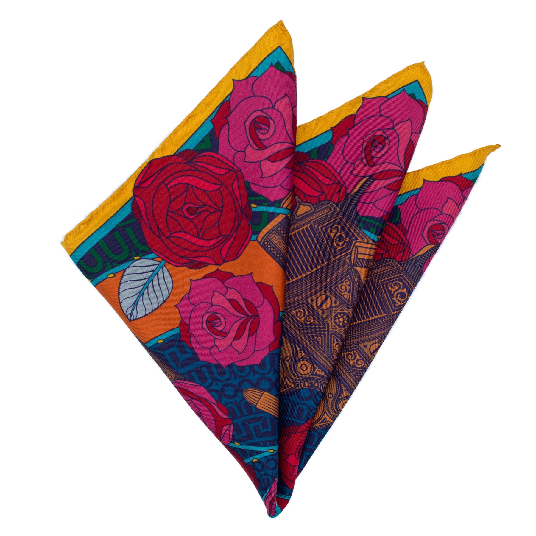 Unique pocket squares, silk ties, square scarves and long silk-wool wraps show exquisitely crafted antique firearms braced in arabesques of roses. This explosive collection juxtaposes beauty and violence in exquisite colour and intricate detail.