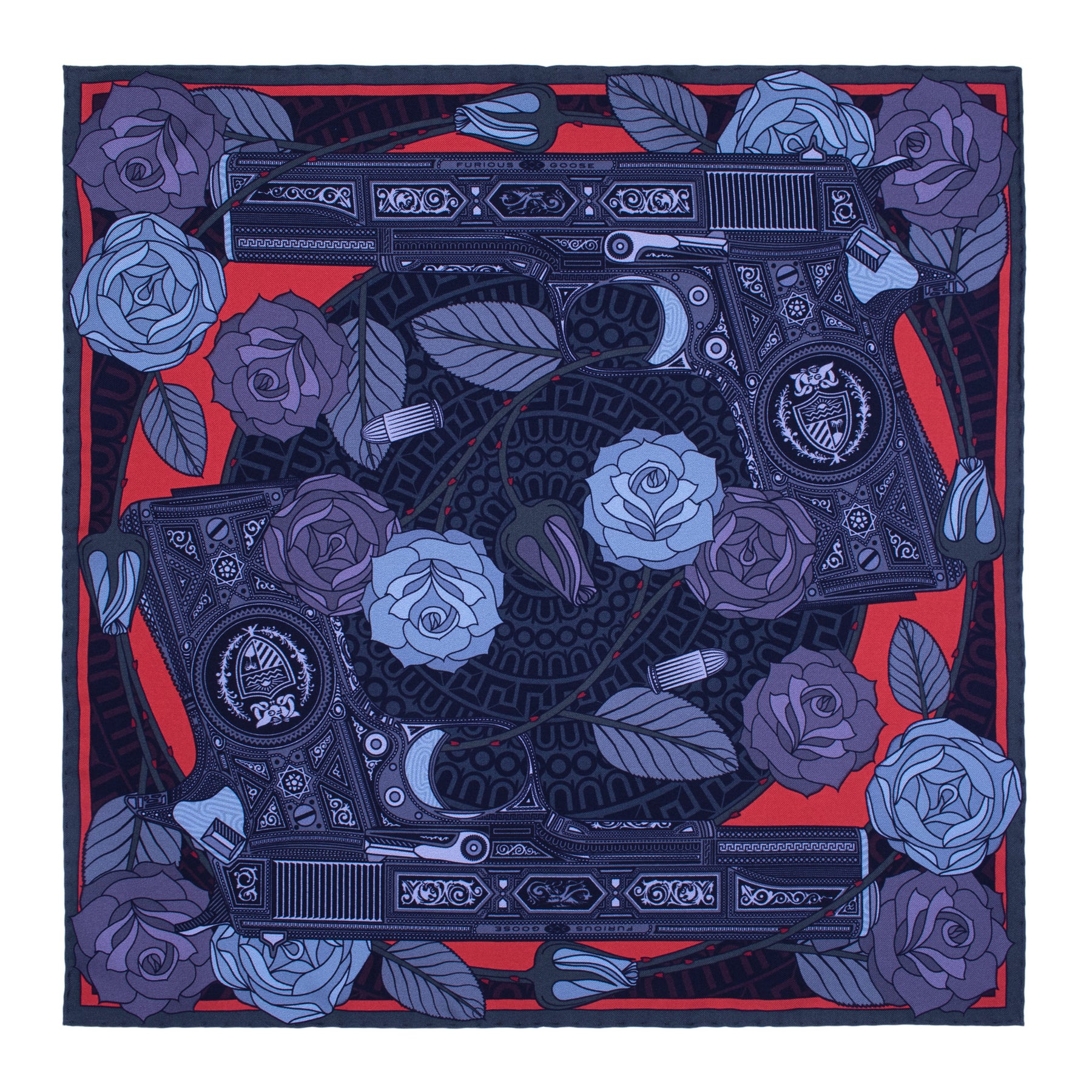 Unique pocket squares, silk ties, square scarves and long silk-wool wraps show exquisitely crafted antique firearms braced in arabesques of roses. This explosive collection juxtaposes beauty and violence in exquisite colour and intricate detail.