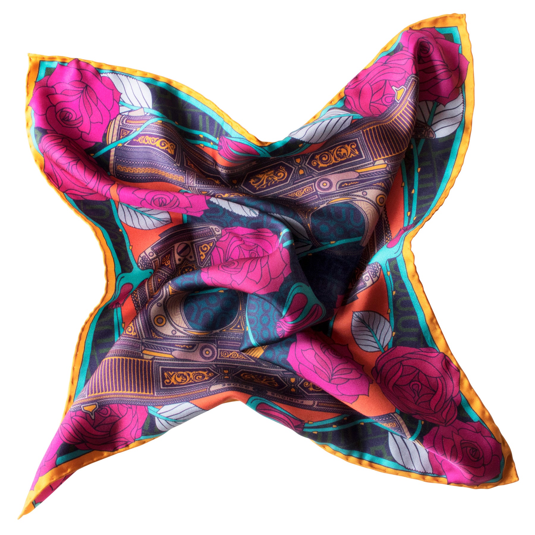 These exquisitely engraved pistols were rumoured to have been given to Frank Sinatra by the mafia. The two heavily decorated Colt 9mms are surrounded by a swirl of art nouveau roses in red and peuce. This is a bright and playful pocket square with a bright orange circular frame and sunshine yellow hand-rolled hem. The gorgeous floral print is contrasted with brooding violence of the guns.