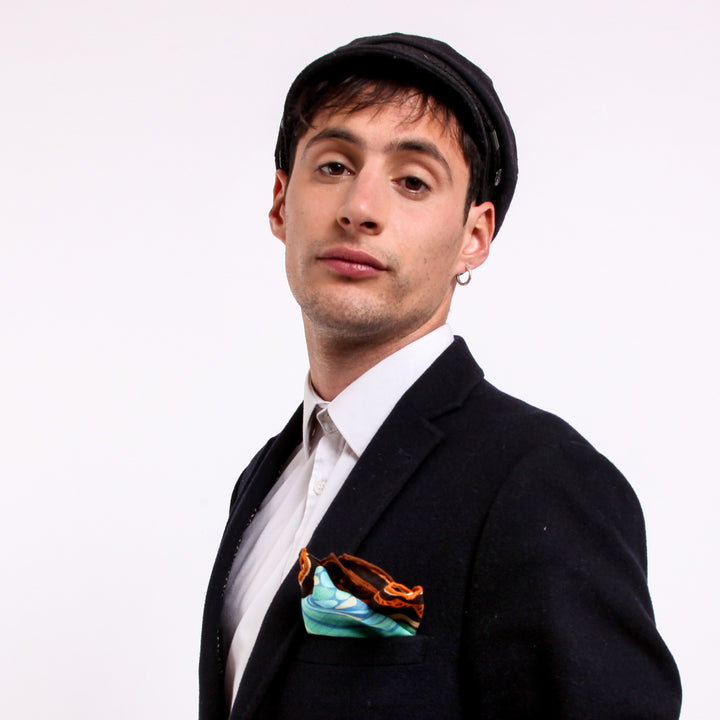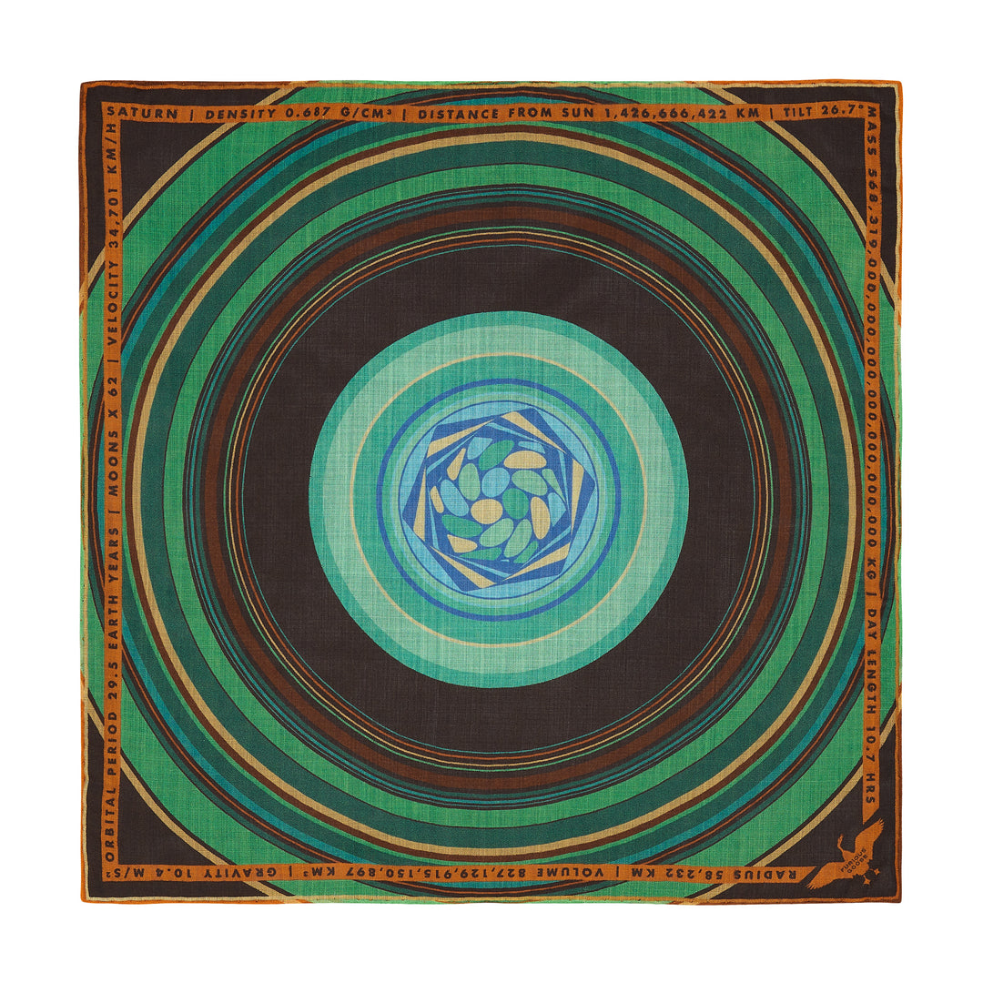 A geometric design of quiet simplicity and concentric circles in chocolate, ochre and mint which looks super-chic in the top pocket. The typographic hem is inscribed with planetary data for the ultimate in geek chic. For the more esoteric among us this is a unique gift idea for Capricorn friends and Aquarius and comes in two options. Luxurious merino wool with a hand-rolled hem, and a smaller option with a neat machine hem in pure silk.