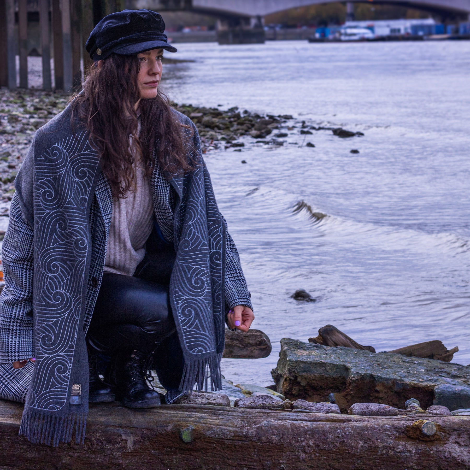 Slate Grey Cashmere Scarves with silver hand-printed pattern inspired by the Thames | Made in England | Furious Goose