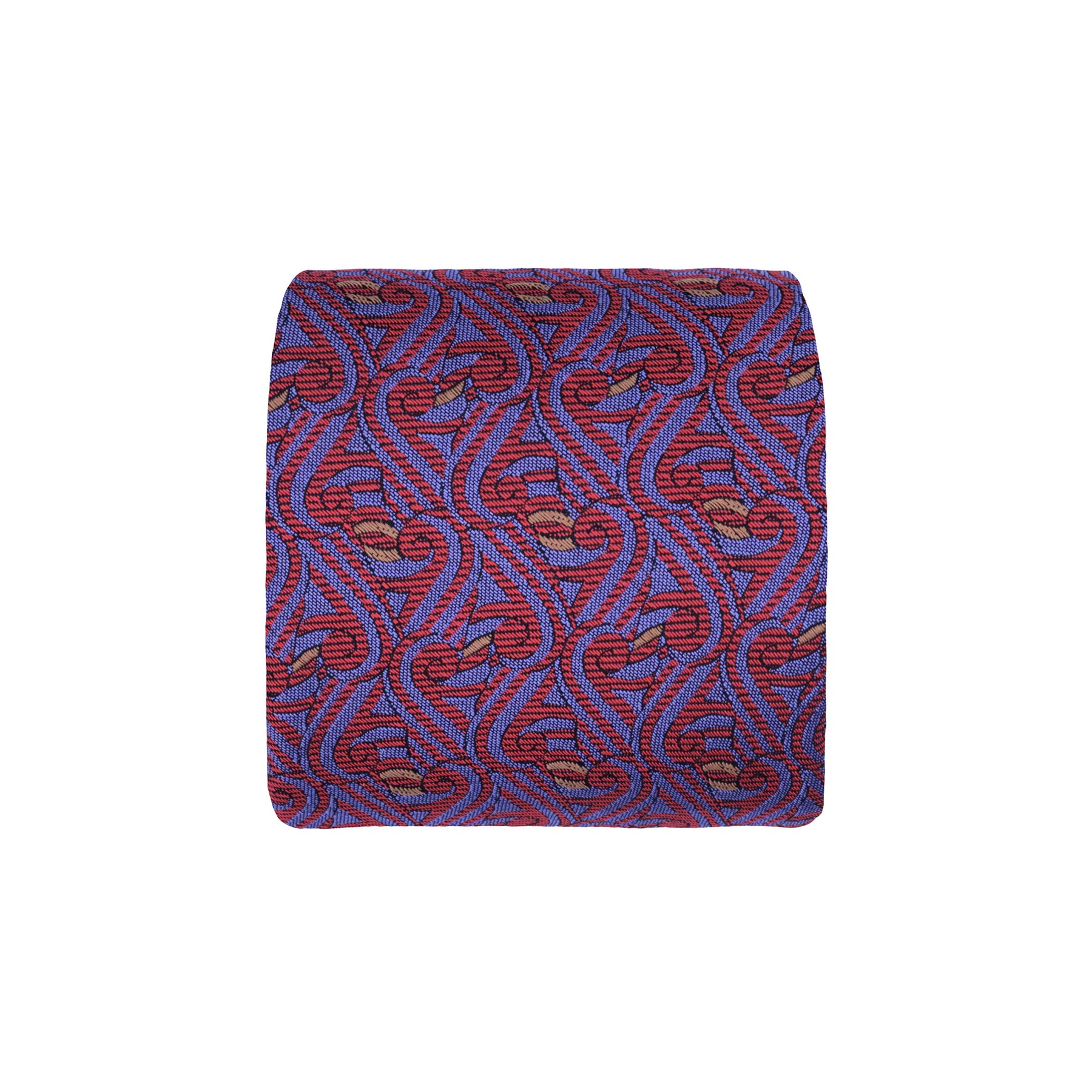 A bold silk jacquard tie in royal blue, crimson and burnished gold, woven with the Thames Pattern for a richly heraldic effect. Hand-made in England from 100% silk, it features a lustrous woven finish, an 8cm blade, and the kind of head-turning presence that transforms a simple shirt-and-jacket combination.